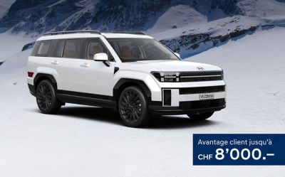 Prime de stock (exemple): SANTA FE MY26 Vertex 1.6 T-GDi PHEV 212 kW / 288 PS 6 AT 4WD, consommation d’énergie (conduite): 3.8 l/100 km + 11.4 kWh/100 km, équivalent essence (total): 5.1 l/100 km, émissions de CO₂ (conduite): 38 g/km, émissions de CO₂ liées à la production de carburant et/ou d’électricité: 30 g/km, catégorie d’efficacité énergétique: E. Prix catalogue: CHF 72'700.– (Prime de stock: CHF 6'500.– + Swiss Edition: CHF 1'770.–). La valeur totale de l’avantage (Prime de stock) dépend du modèle et du véhicule. Offre valable du 07.02.2026 au 30.04.2026 et jusqu’à épuisement du stock. Offres réservées aux clients privés et aux concessionnaires participants. Tous les montants incluent la TVA. Prix indicatifs non contraignants, sous réserve de modifications. L’offre est valable uniquement pour les véhicules en stock. L'offre n'est pas cumulable avec le Power Leasing.