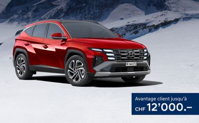 Prime de stock (exemple): TUCSON MY26 PHEV Vertex Sunroof Swiss Edition 1.6 T-GDi PHEV 212 kW / 288 PS 6 AT 4WD, consommation d’énergie (conduite): 3.3 l/100 km + 11.2 kWh/100 km, équivalent essence (total): 4.5 l/100 km, émissions de CO₂ (conduite): 30 g/km, émissions de CO₂ liées à la production de carburant et/ou d’électricité: 28 g/km, catégorie d’efficacité énergétique: E. Prix catalogue: CHF 62'400.– (Prime de stock: CHF 12'500.– + Swiss Edition: CHF 1'850.–). La valeur totale de l’avantage (Prime de stock) dépend du modèle et du véhicule. Offre valable du 07.02.2026 au 30.04.2026 et jusqu’à épuisement du stock. Offres réservées aux clients privés et aux concessionnaires participants. Tous les montants incluent la TVA. Prix indicatifs non contraignants, sous réserve de modifications. L’offre est valable uniquement pour les véhicules en stock. L'offre n'est pas cumulable avec le Power Leasing.